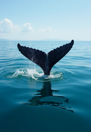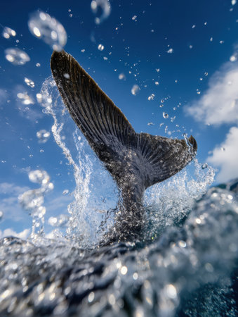 A magnificent whale tail emerges gracefully from the deep blue ocean, splashing water droplets while surrounded by calm waters during a sunny day, evoking a sense of wonder.
