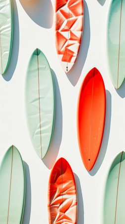 Flat lay pattern of surfboards, pastel green and red colors. White background, copy space. Summer concept. Generative AI.