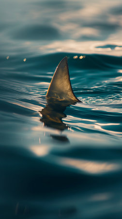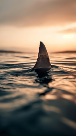 A striking image capturing a shark fin breaking the surface of the ocean at sunset, with vibrant colors illuminating the water. The serene atmosphere evokes a sense of adventure and connection to nature.