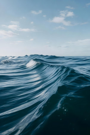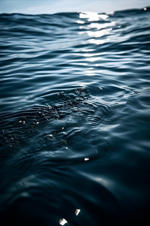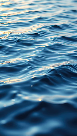 This image captures a serene water surface with gentle blue waves. Soft light reflections create a tranquil atmosphere, perfect for evoking feelings of relaxation and peace.