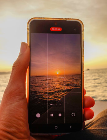 human hand holding cell phone and recording the sunset at sea.
