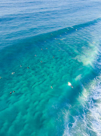 Surfers on the waves in the ocean, top view.