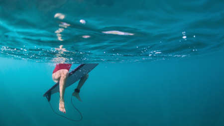 Fit active girl in bikini. Surfer on surf board wait for ocean wave. Woman feet and surfboard underwater photo. People in water sport adventure camp. Swimming, extreme surfing on summer beach holiday