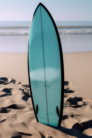 Generative AI illustration of a vividly colored surfboard stuck in the sand of a beach on holidays. summer concept