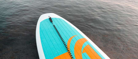 Close up of stand up SUP paddle board on lake or sea with blue water lilies, paddling in summer time at sunset. Summer family vacation