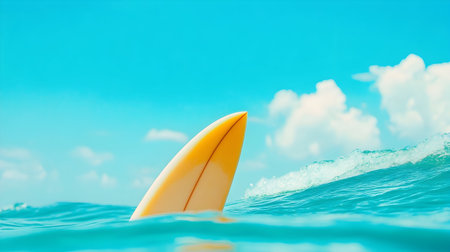 Bright yellow surfboard breaks the surface of a stunning blue ocean on a sunny day