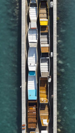 Generative AI : Aerial view of fishing boat docked at the pier in Marzamemi harbour Pachino Syracuse Sicily Italy