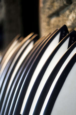 Set of black and white stylish new surf boards in a stack on concrete background. Summer sport concept