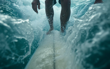 Close-up of surfers feet on surfboard in ocean.
