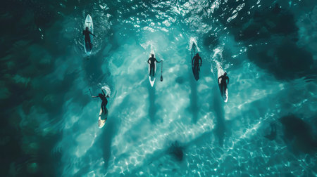 An aerial shot of surfers swimming laying on their boards in the sea waiting for strong waves to come