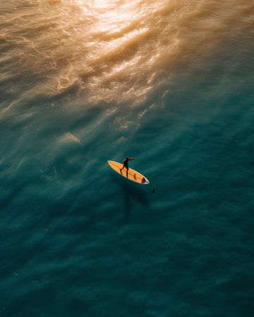Surfer in the sea. Aerial view of a man on a stand up paddle board.