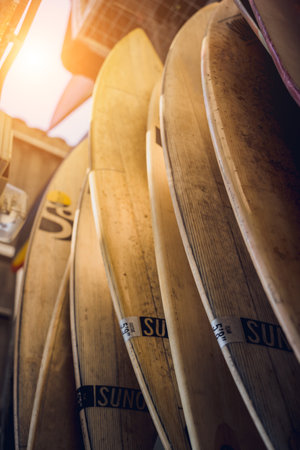 Colorful surf boards in shop for rent on the beach. water sports equipment. vintage color tone effect.