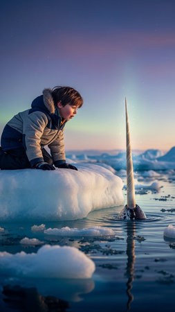 Intense close-up of a narwhal's tusk against icy blue waters