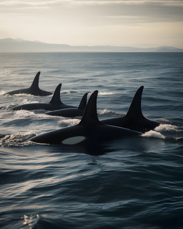 A pod of killer whales swimming in the crystal clear waters of the ocean, AI-generated.