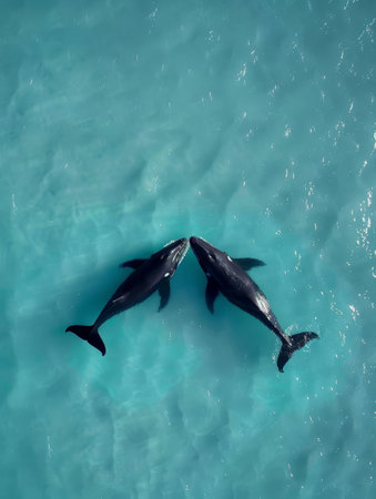 A mother whale and her calf gently swim together in calm, clear blue ocean waters under bright sunlight, showingcasing their bond.