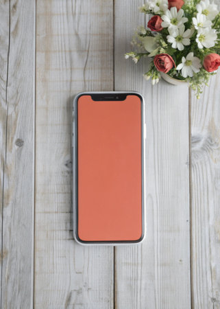 Black smartphone with a white blank screen on a blue background. Horizontal orientation, copy space