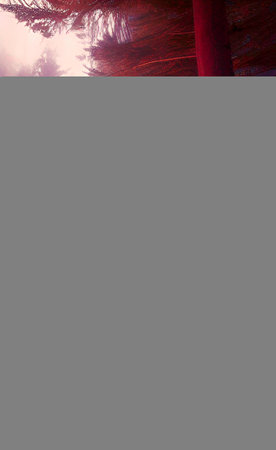 Pine trees in the morning mist. Beautiful natural background. Toned.