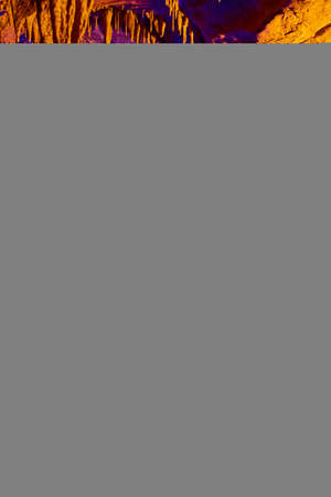 Cave tour in midwest of river with blue lights and formations of stalactites