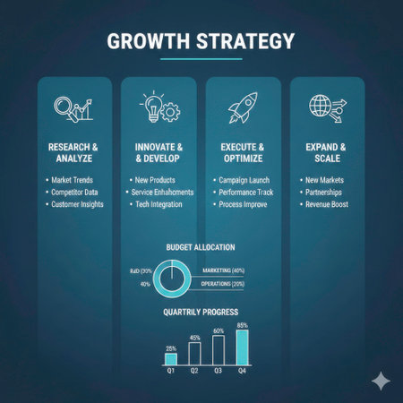 This detailed infographic outlines a four-phase business growth strategy, starting with 'Research & Analyze' to understand market trends, competitor data, and customer insights. The process then moves to 'Innovate & Develop,' focusing on new products, service enhancements, and tech integration. The third phase, 'Execute & Optimize,' covers campaign launch, performance tracking, and process improvement. Finally, 'Expand & Scale' aims for new markets, partnerships, and revenue boost. The infographic also presents data visualization elements, including a donut chart for budget allocation among R&D (30%), marketing (40%), and operations (30%), as well as a bar chart illustrating quarterly progress from Q1 (20%) to Q4 (95%), showing consistent growth.