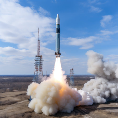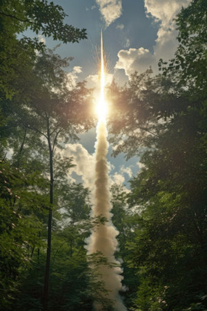 Powerful missile launch with fiery engines igniting the sky leaving a spectacular trail of smoke and light