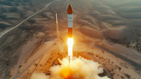 A powerful rocket ascends from a desert launchpad, its fiery exhaust creating a dramatic spectacle against the twilight sky as it begins an incredible journey.