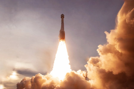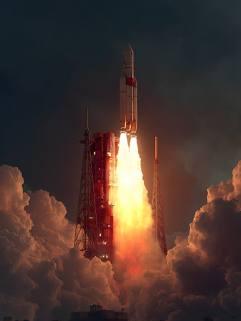 Massive Rocket Launches Into Evening Sky, Sending Payload Towards Orbit as Flames and Smoke Billow From Booster Engines Generative AI