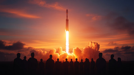 Rocket Launch at Dusk Showcasing Powerful Propulsion and Retropropulsion for Successful Spaceflight Operations Generative AI