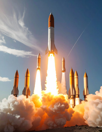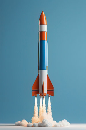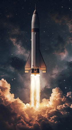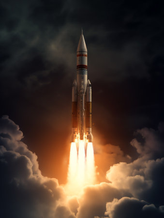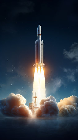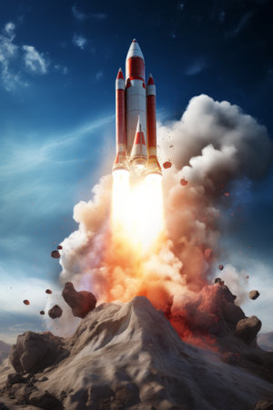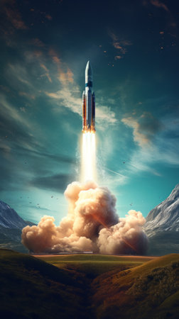 Embark on a journey of innovation and ambition with this captivating image. A rocket launch symbolizes the spirit of startups and the dynamic nature of the business world. This concept captures the excitement and determination that drive entrepreneurs and their quest for success. The fiery propulsion of the rocket represents the power of ideas and the drive to reach new heights. Perfect for projects related to startups, entrepreneurship, business concepts, technology, innovation, and the pursuit of ambitious goals