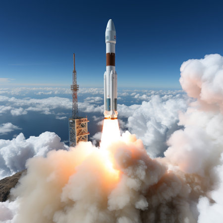 Modern space rocket soaring through the cloudy sky
