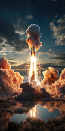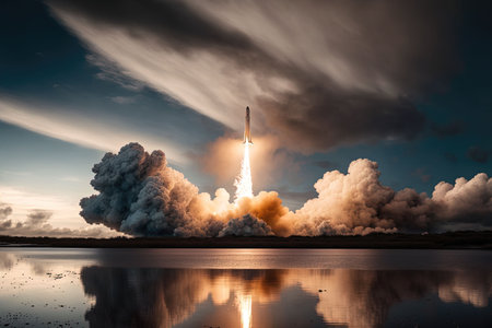 Launch of a Powerful Rocket Into the Sky as the Sun Sets Behind the Clouds Reflecting in the Calm Water Below Generative AI