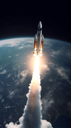 rocket launches into the starry night sky, with earth visible below, created with generative ai