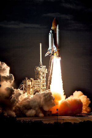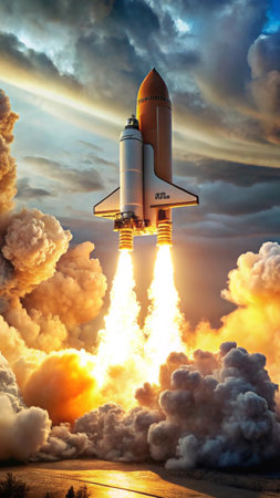 Launch of a space shuttle into space.