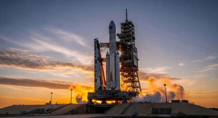 NASA's massive Space Launch System (SLS) rocket for the Artemis mission stands ready on the launchpad, surrounded by its gantry tower as steam billows out. The stunning sunrise in the background signals the dawn of a new era in space exploration.