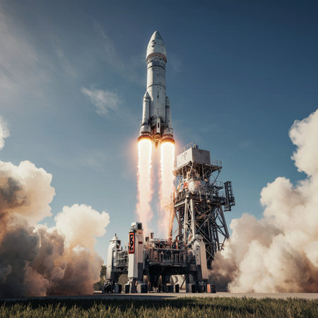 A large rocket launches vigorously into the clear sky, flames and smoke billowing from its engines as it breaks free of the launchpad.