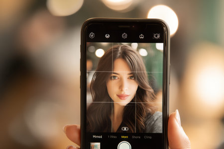 A young woman with flowing hair smiles while being framed on a smartphone camera interface in a lively indoor setting during daylight hours.
