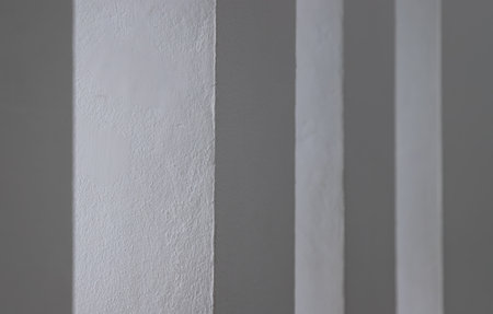 Sunlight shines through light channel of White cement wall background. Abstract interior design, Space for text, Selective Focus.