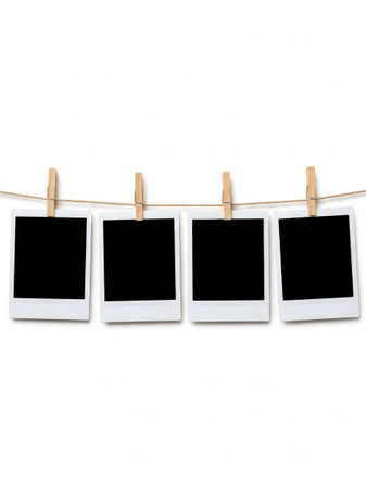 Four Polaroid photos hanging on wooden clothespins against a clean white background, representing vintage photography and nostalgia.