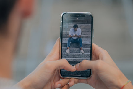 Young adult caucasian male capturing cityscape on smartphone in urban street.