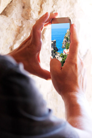 A man's hands with a mobile phone showing a seascape on a blurred background