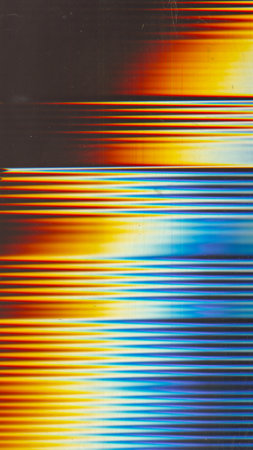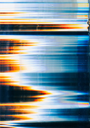 Glitch texture. Analog distortion. Blockchain technology. Blue orange white color electronic artifacts noise on black illustration abstract background.