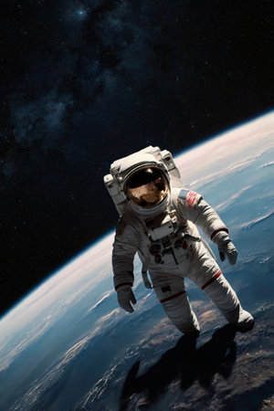 Astronaut floats in the vast expanse of space, with the earth visible below, showcasing the wonders of space exploration and the beauty of our planet