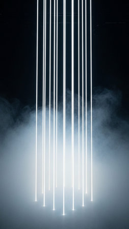 Sharp, vertical abstract shot of pure white laser beams cutting through billowing smoke in a dark room, creating dramatic, parallel light columns.