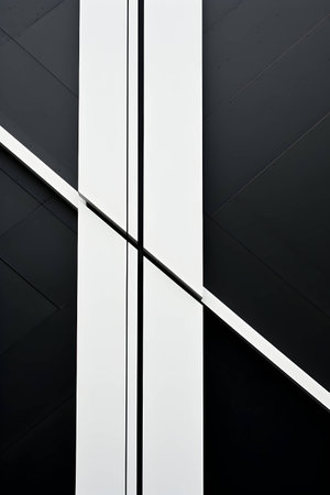 A stark monochromatic composition featuring a sharp diagonal division between dark and light vertical lines creating a dynamic abstract pattern.
