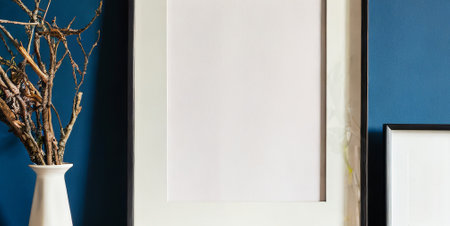 Vertical golden picture frame leaning on blue wall with stoinecrop flowers in vase mockup template. Blank image area of 3 by 4 aspect ratio isolated