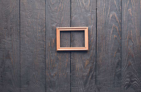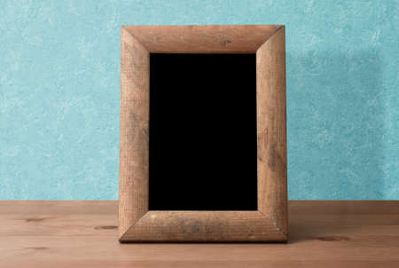 Wooden photo frame hanging on the wall in a cafe. Retro style
