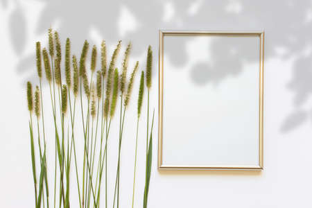 Mockup. A wooden photo frame on a textured wall with stalks of fluffy dried grass.
