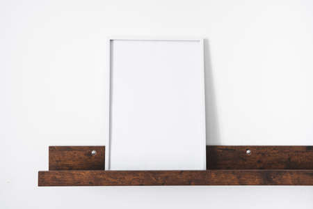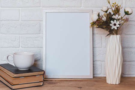 Photo frame mockup on white brick wall with wooden table, book. Picture vertical frame mock up template with beige color.