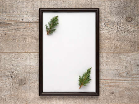 Photo frame with a sheet of white paper with copy space and Christmas tree branches inside on a wooden surface. Flat lay, view from above, vertical layout
