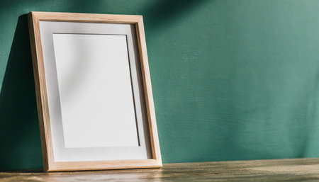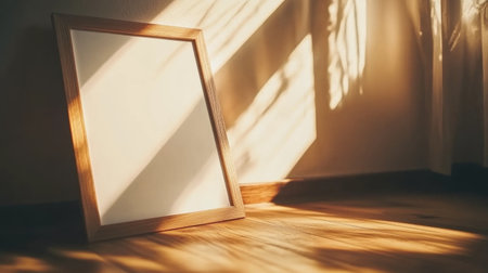 A close-up shot of an empty white poster in a wooden frame, leaning against a wall on the floor. Rays of window light are shining through, in a modern boho apartment setting with minimalist decor and neutral tones and wall colors. --chaos 30 --ar 16:9 --v 6.1 Job ID: f64d3dc3-44b6-41ab-9779-aa36b9517100