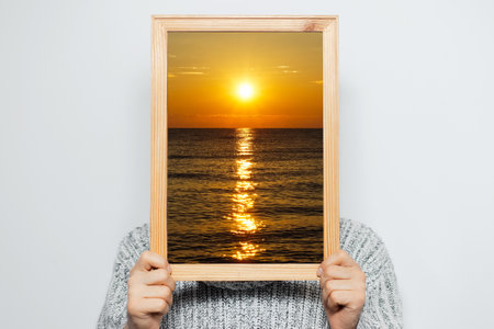 Portrait of young guy holding picture with ocean at sunset, on white background. Artwork collage.